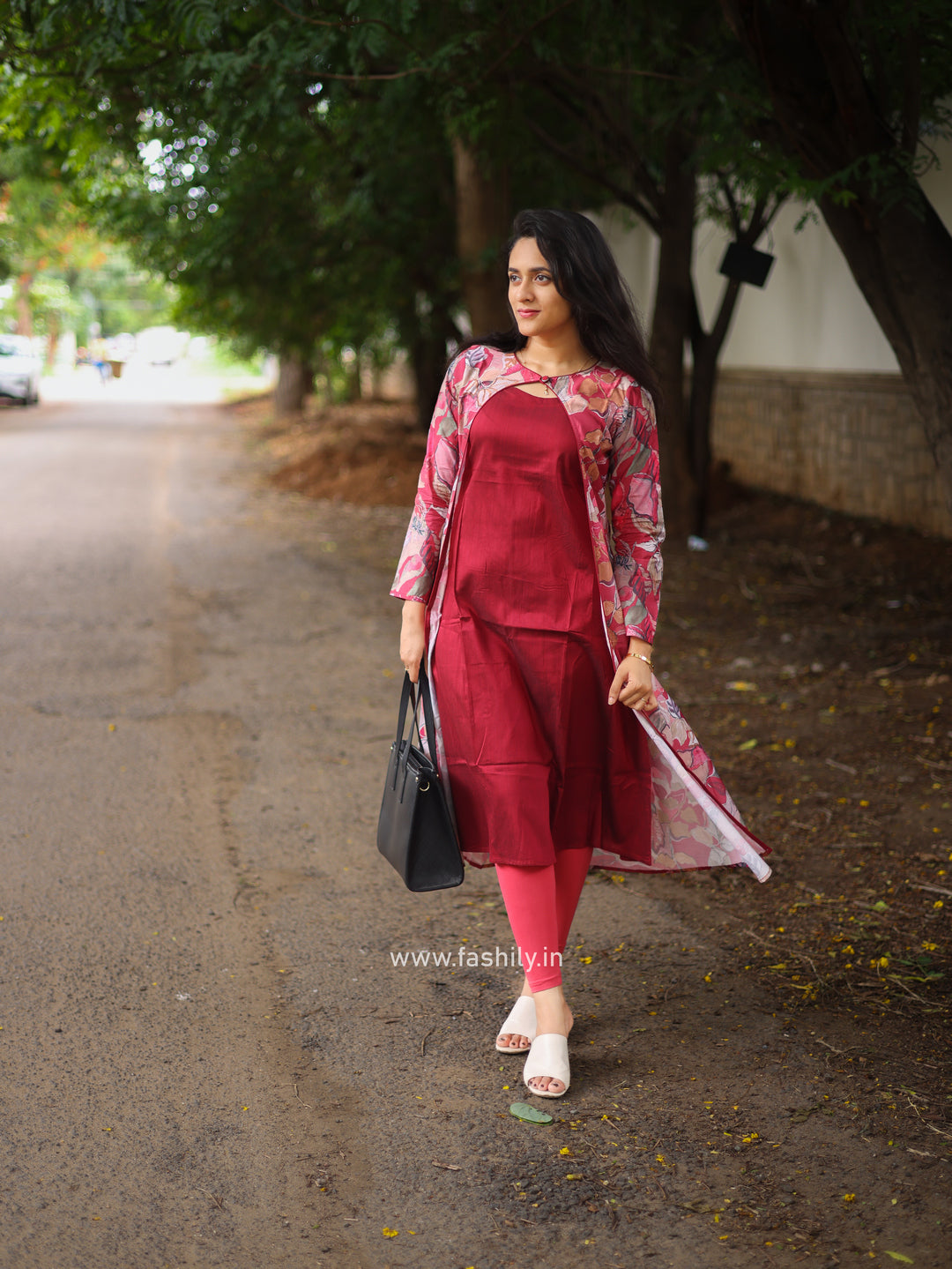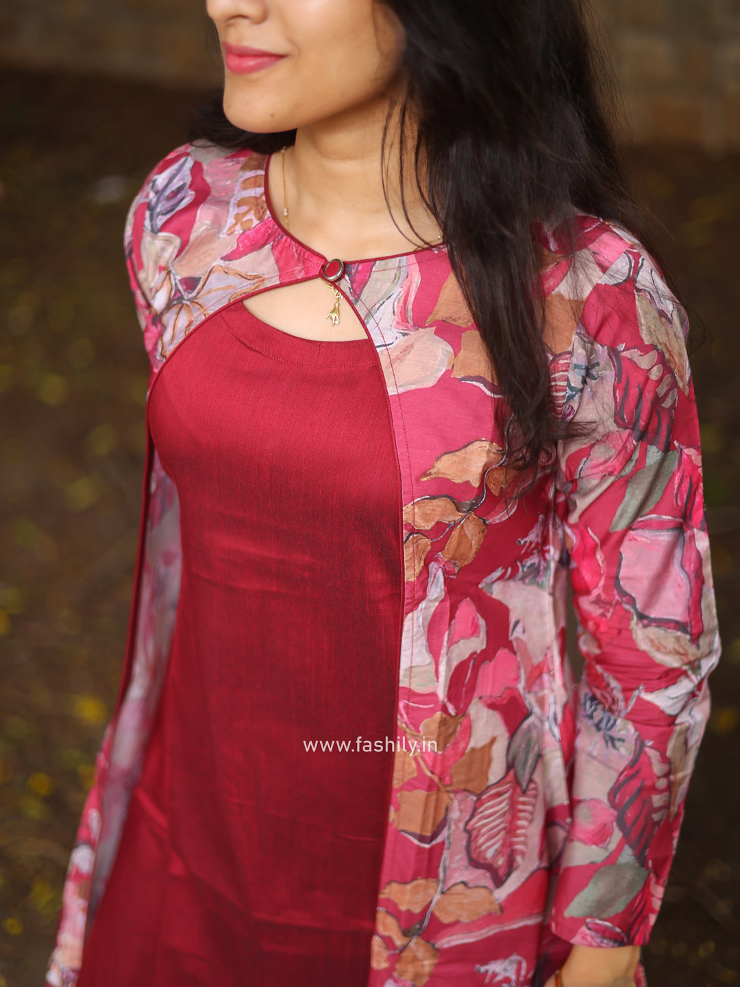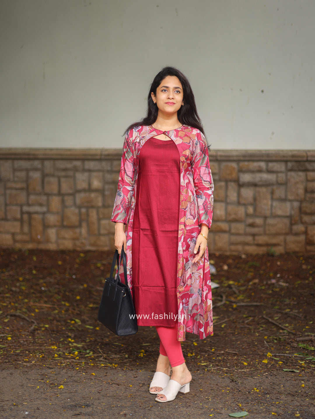 Be the fashion icon with our Fashily 2-piece set. Crafted with a maroon slub silk sleeveless kurti and a printed blazer, this outfit offers versatility and chic style. Mix and match or wear together, the choice is yours. Upgrade your wardrobe with this trendy and fashionable set. Both peices are seperatable and can be worn alone or together as per your convenience