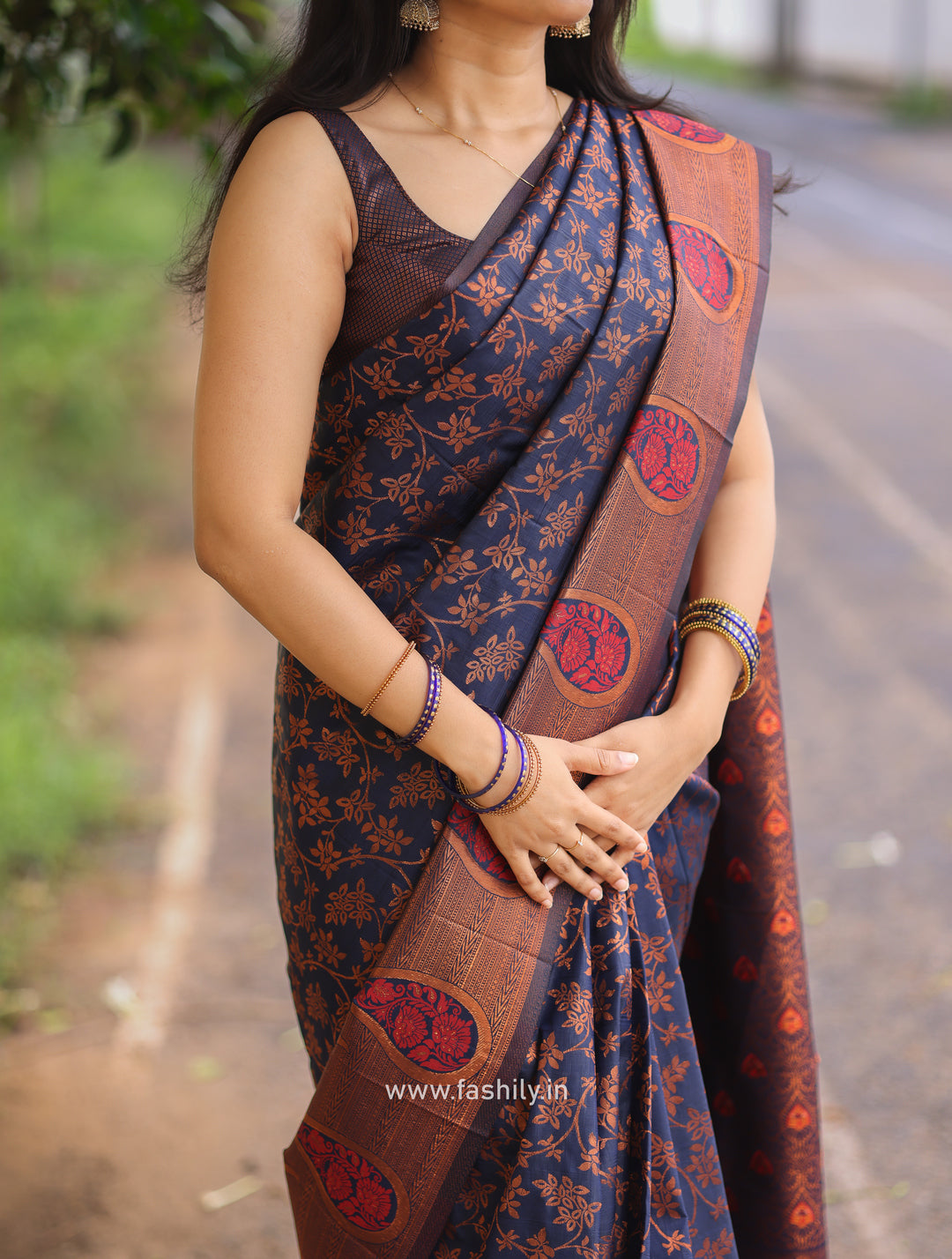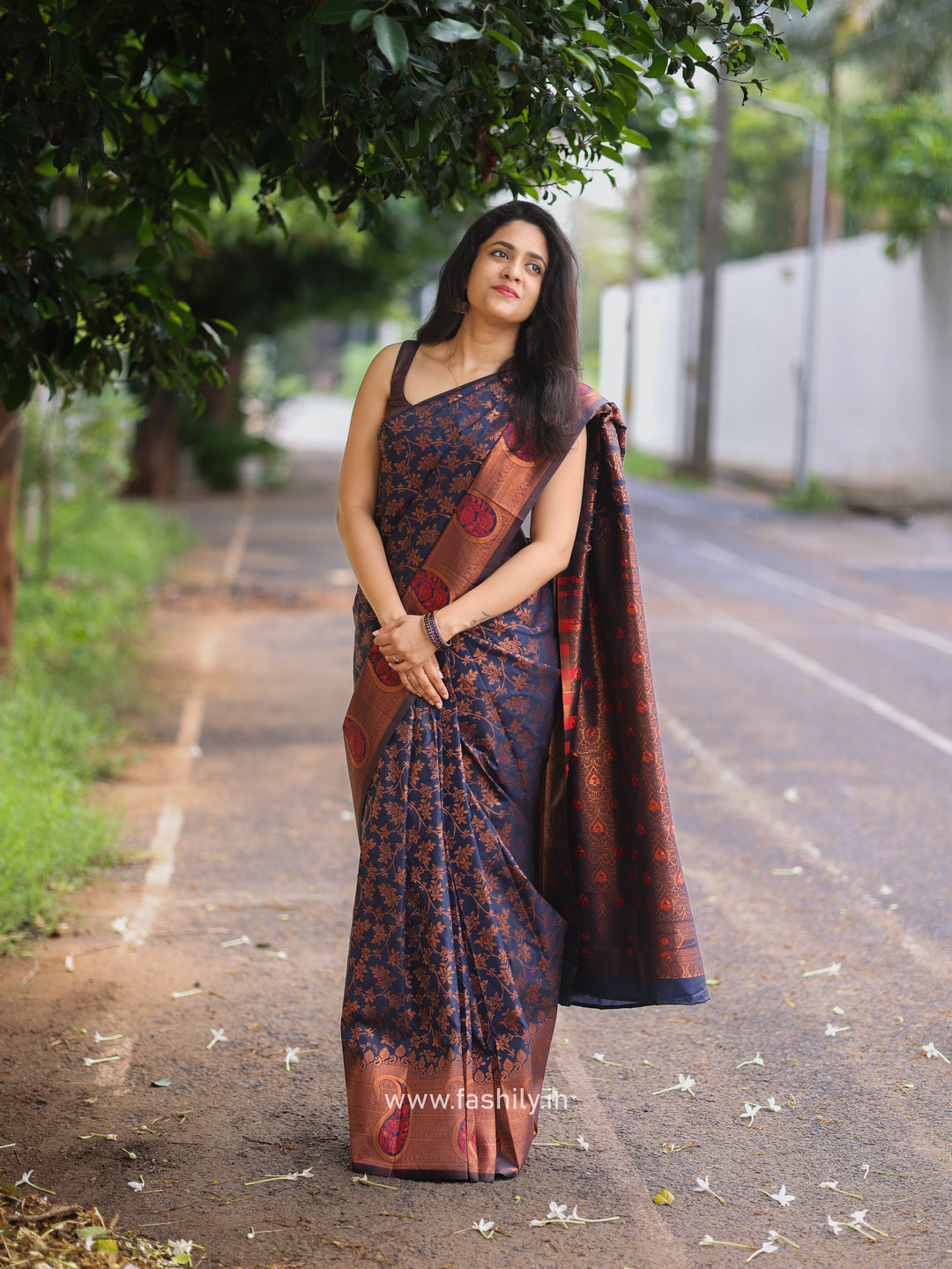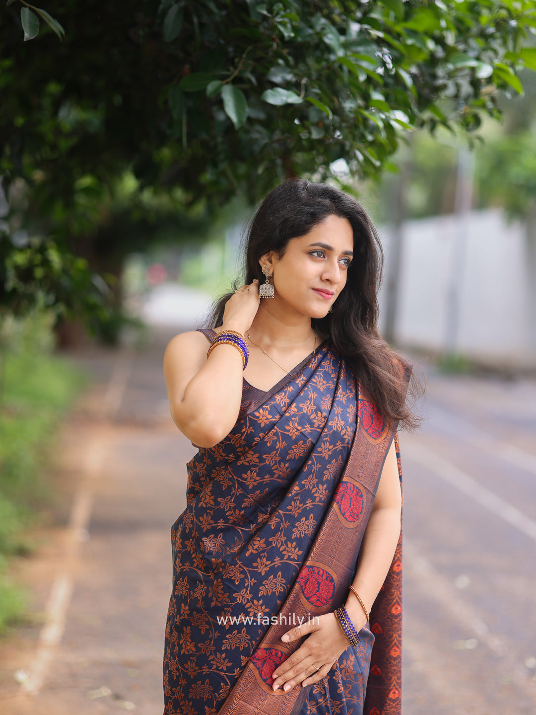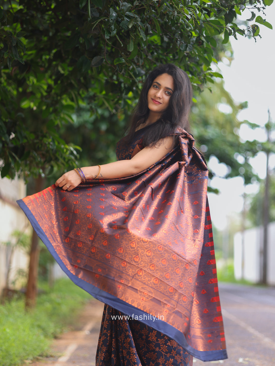 Fashily Elegant Navy Blue Saree with Jari Work and Red Meena Highlights