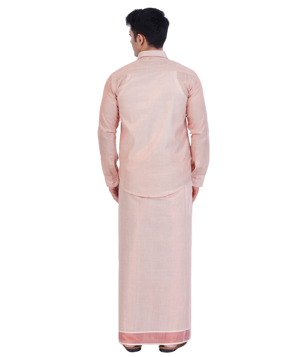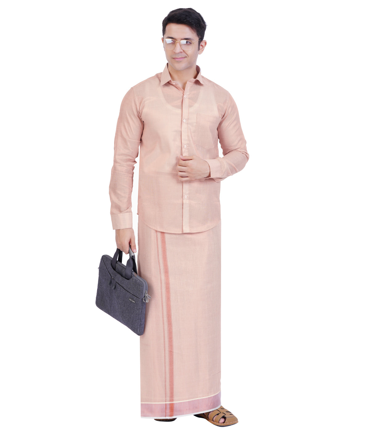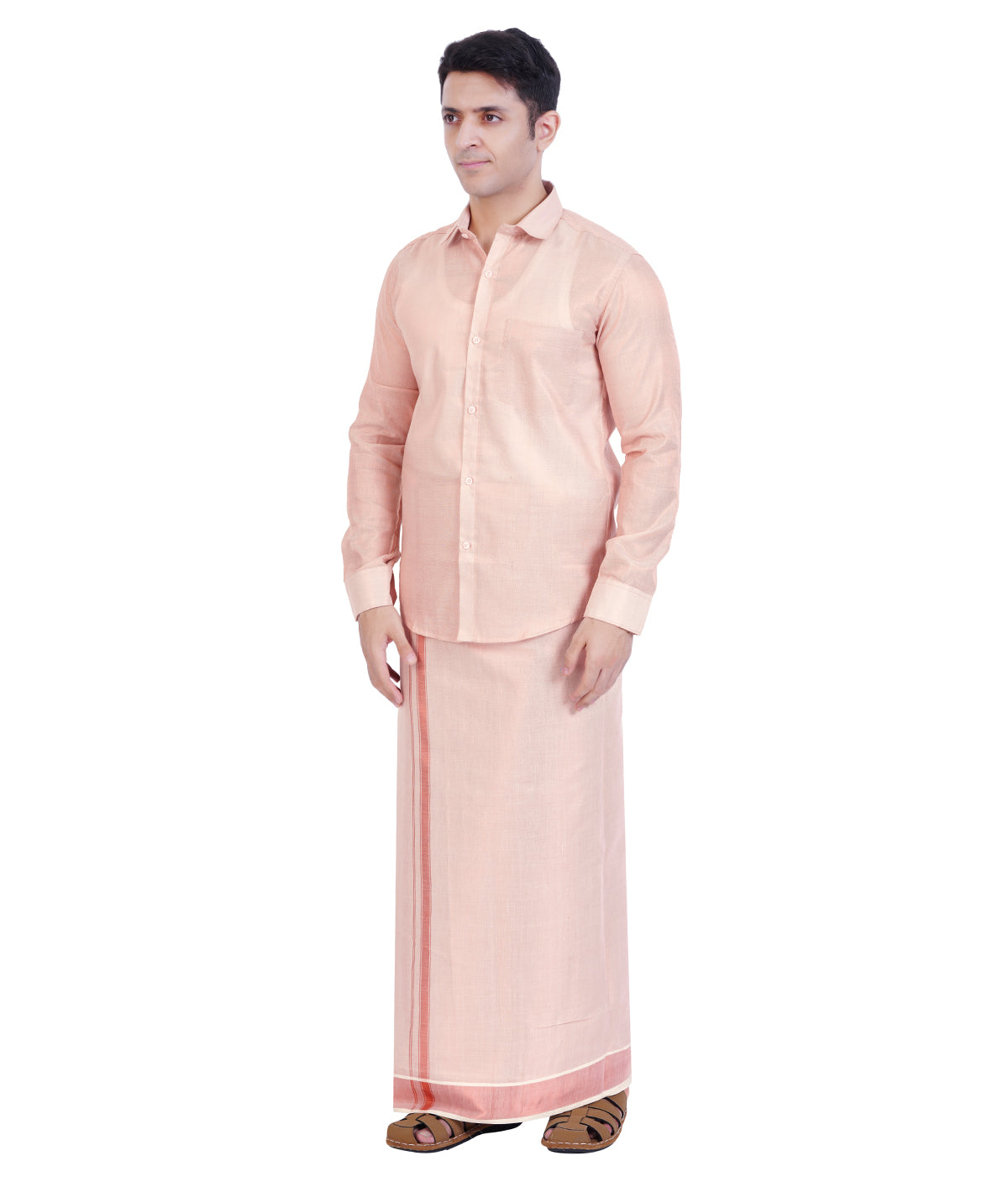 - Bold Colors: Set includes a shirt and matching dhoti for a vibrant traditional look. Copper and golden options available too for variety. With Double Dhoti 4 metres for men