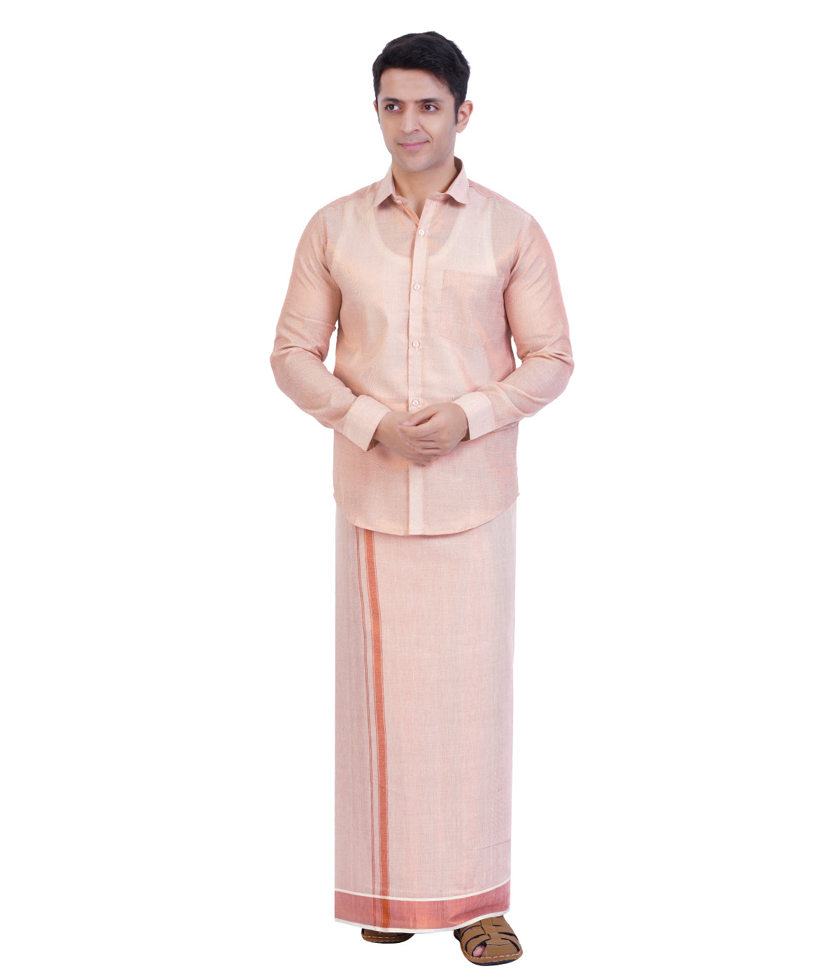 Fashily Men's Traditional Indian Shirt and Dhoti Set, Full Sleeves Tissue Silk Cotton Shirt With Double Dhoti 4 metres for men - Copper Full Sleeve Shirt and Dhoti