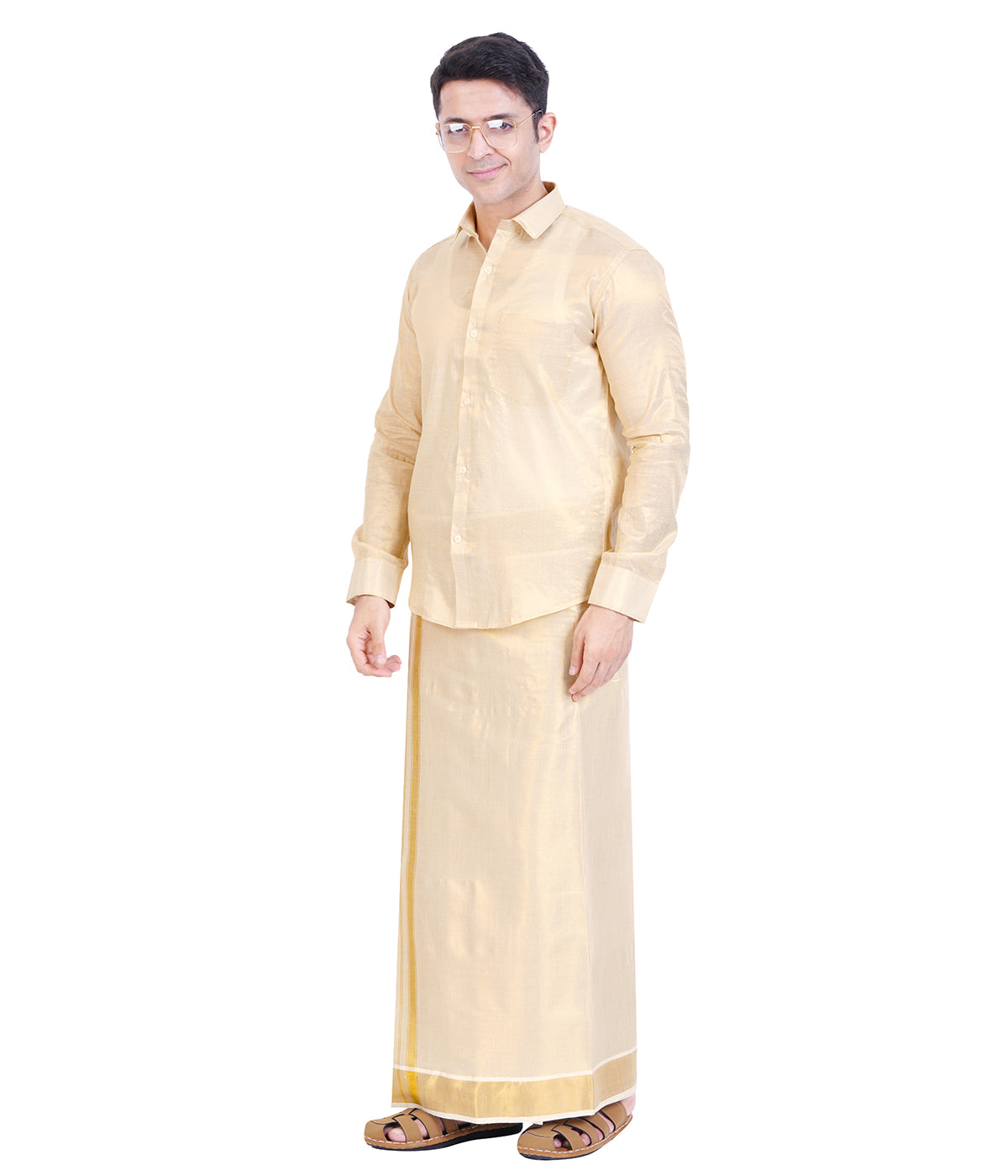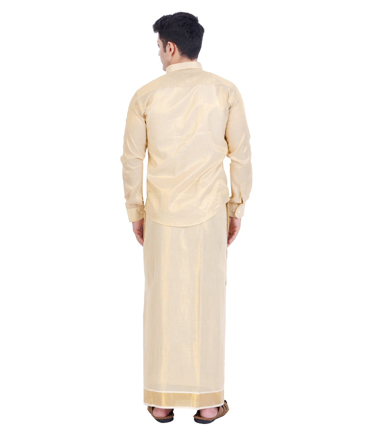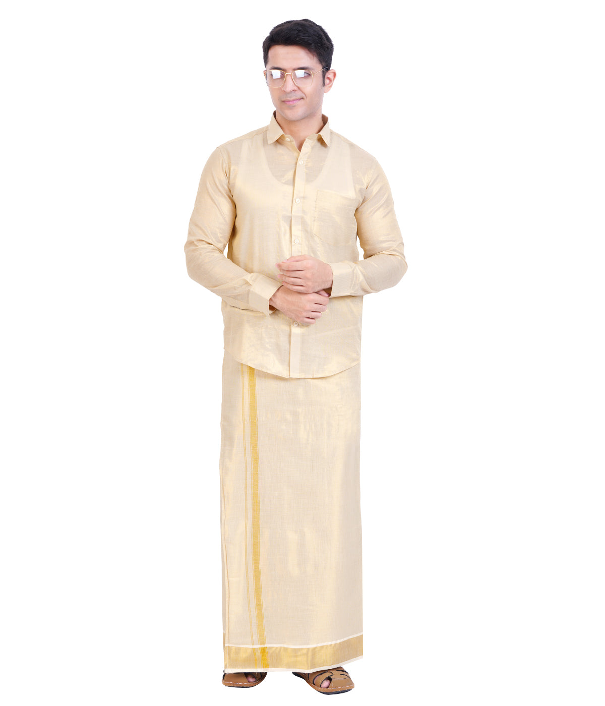 Fashily Men's Traditional Indian Shirt and Dhoti Set, Full Sleeves Tissue Silk Cotton Shirt With Double Dhoti 4 metres for men - Gold Full Sleeve Shirt and Dhoti