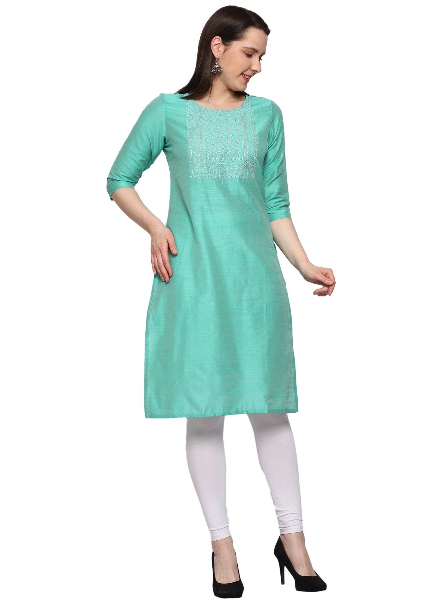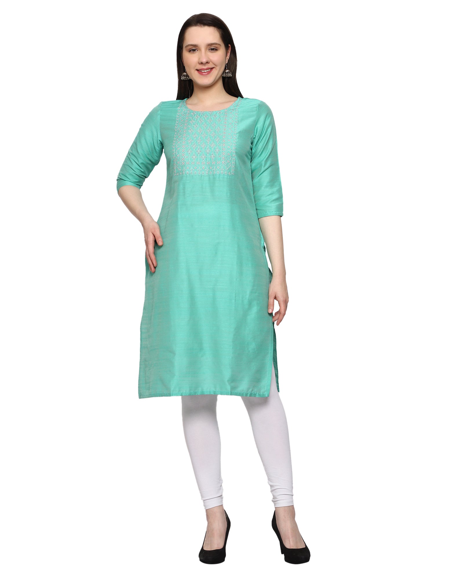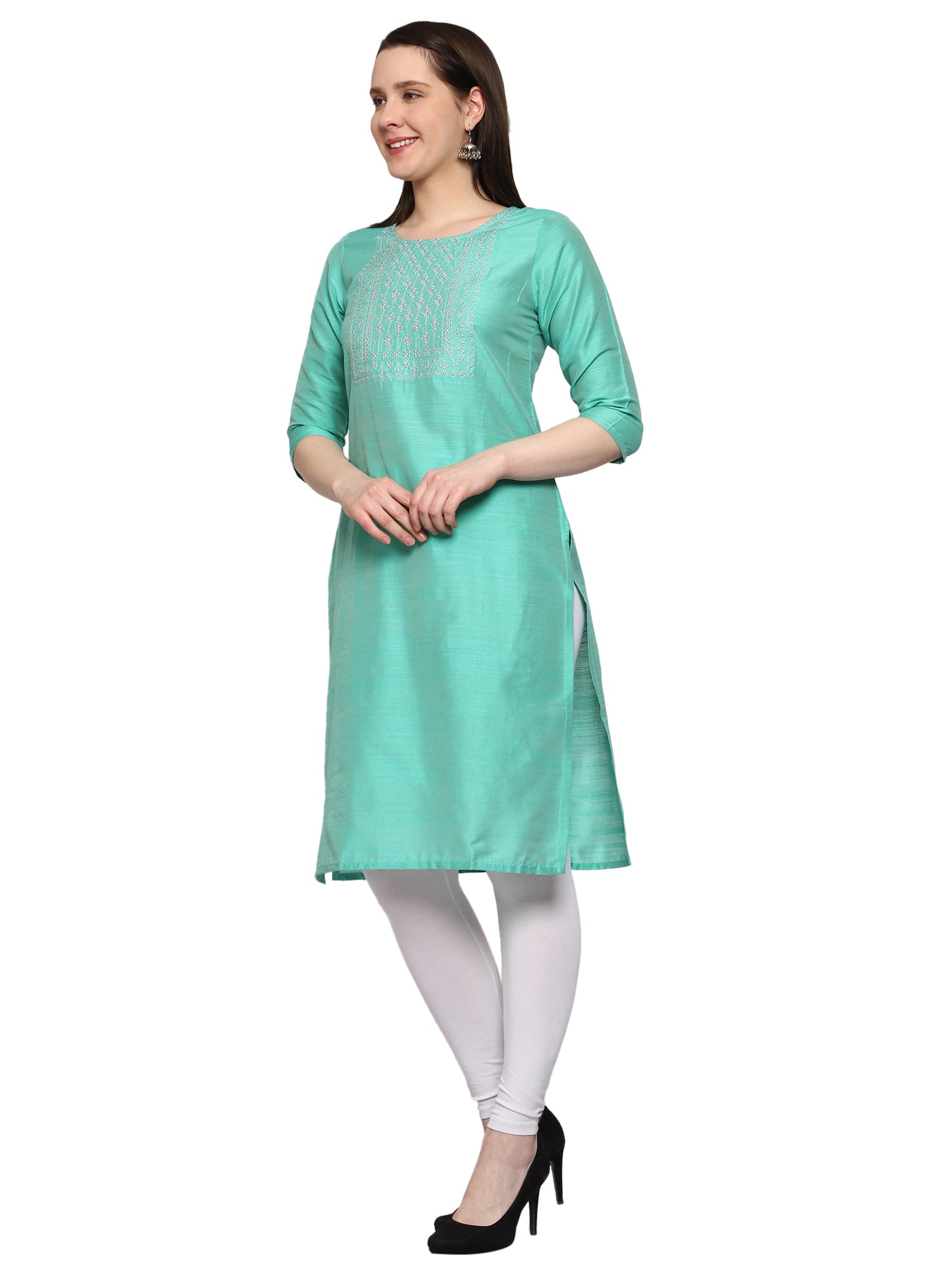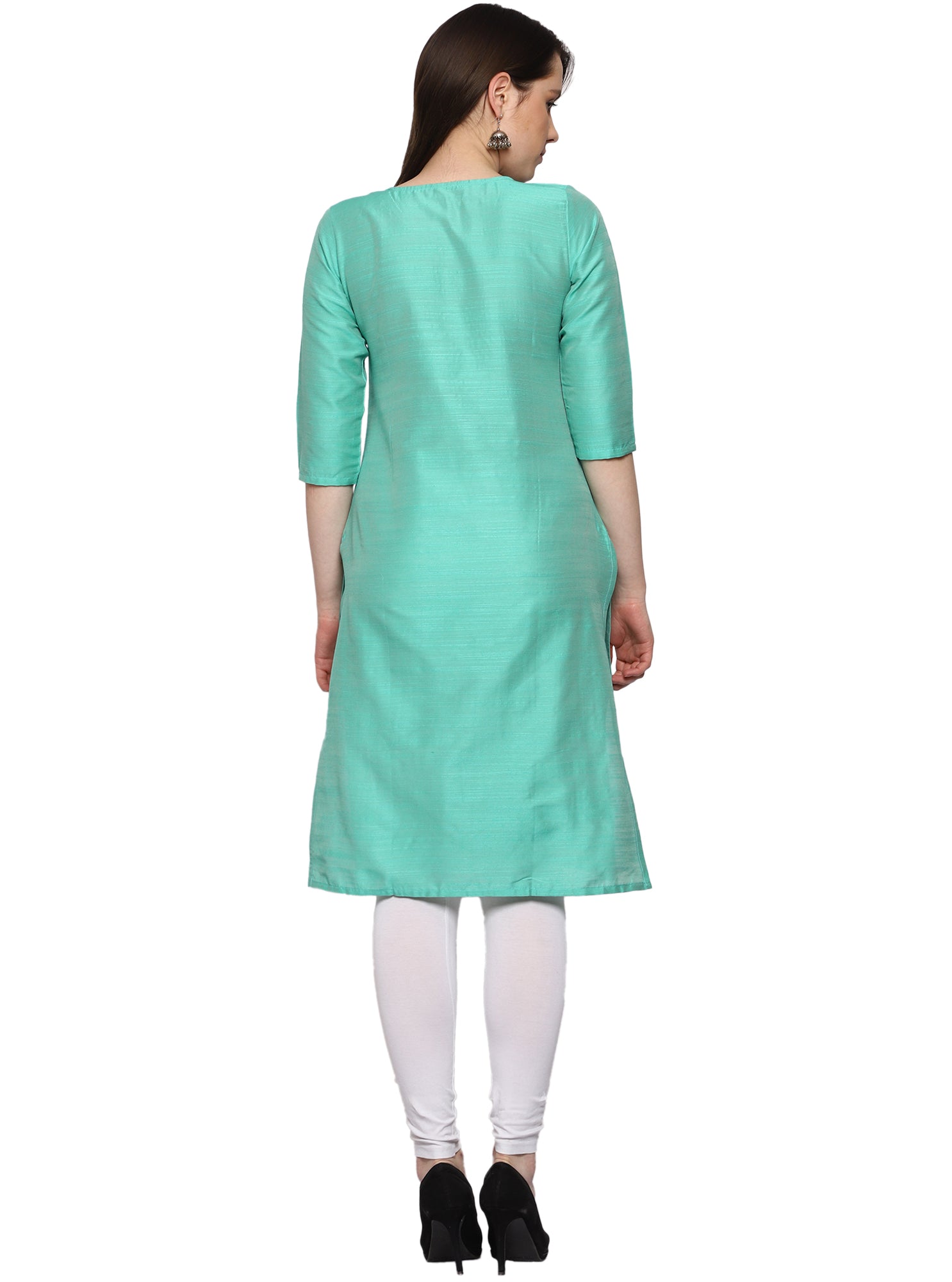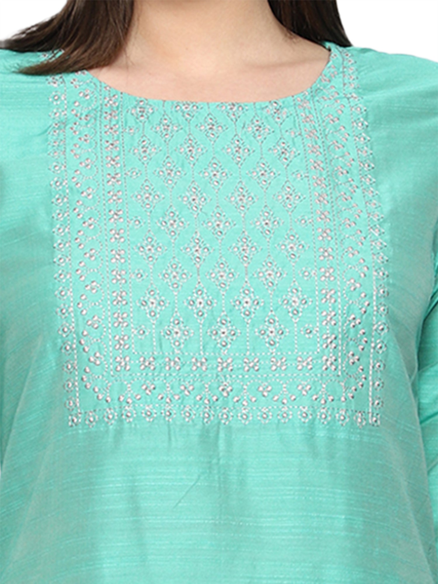 Women's Embroidery Slub Silk Kurti - Mint