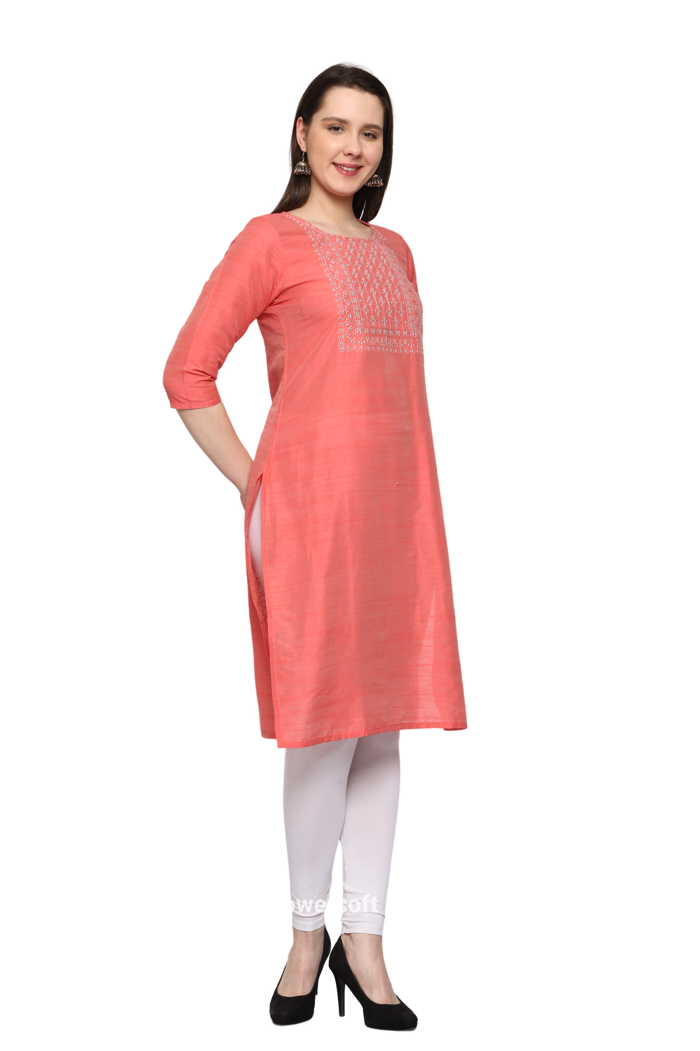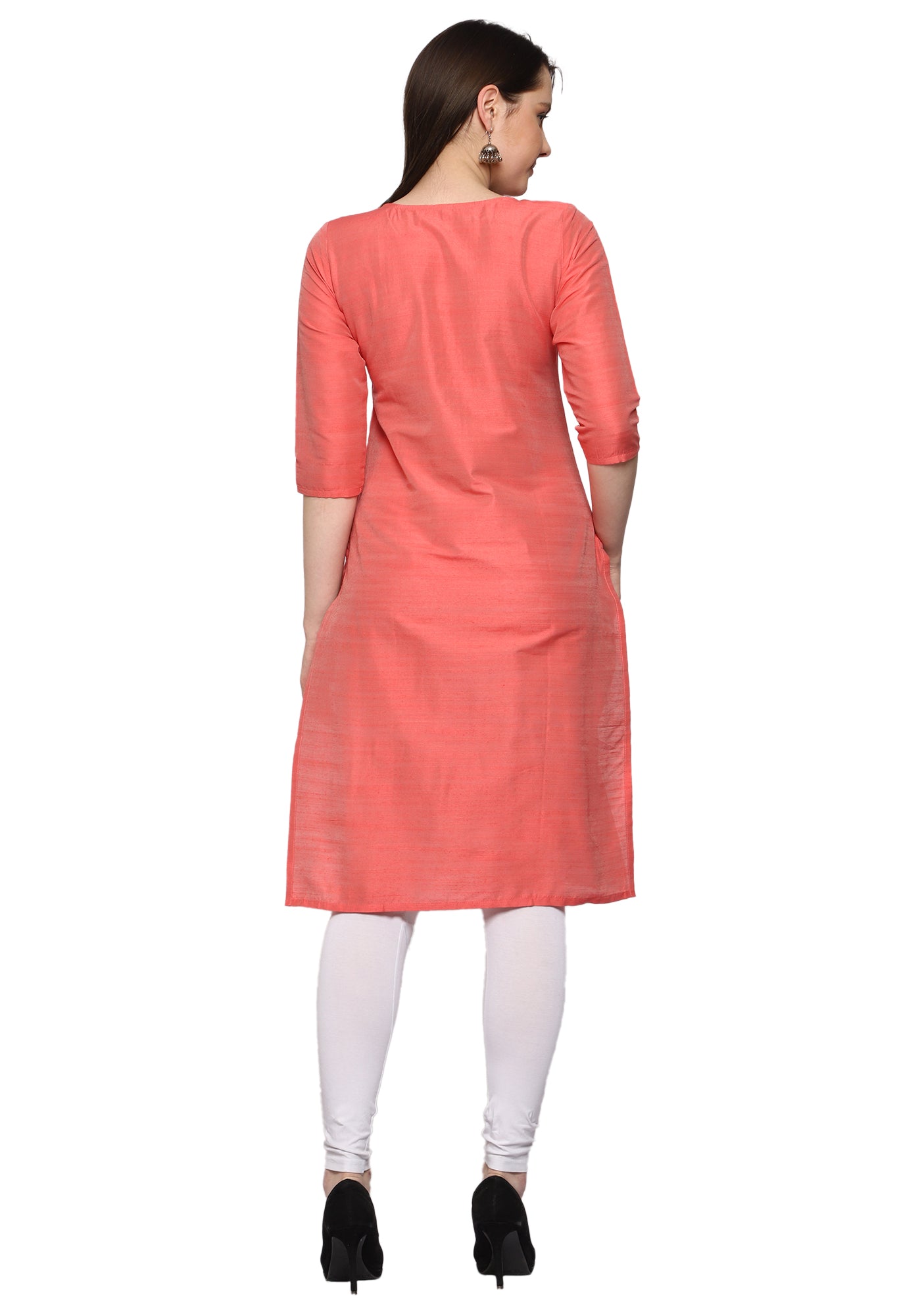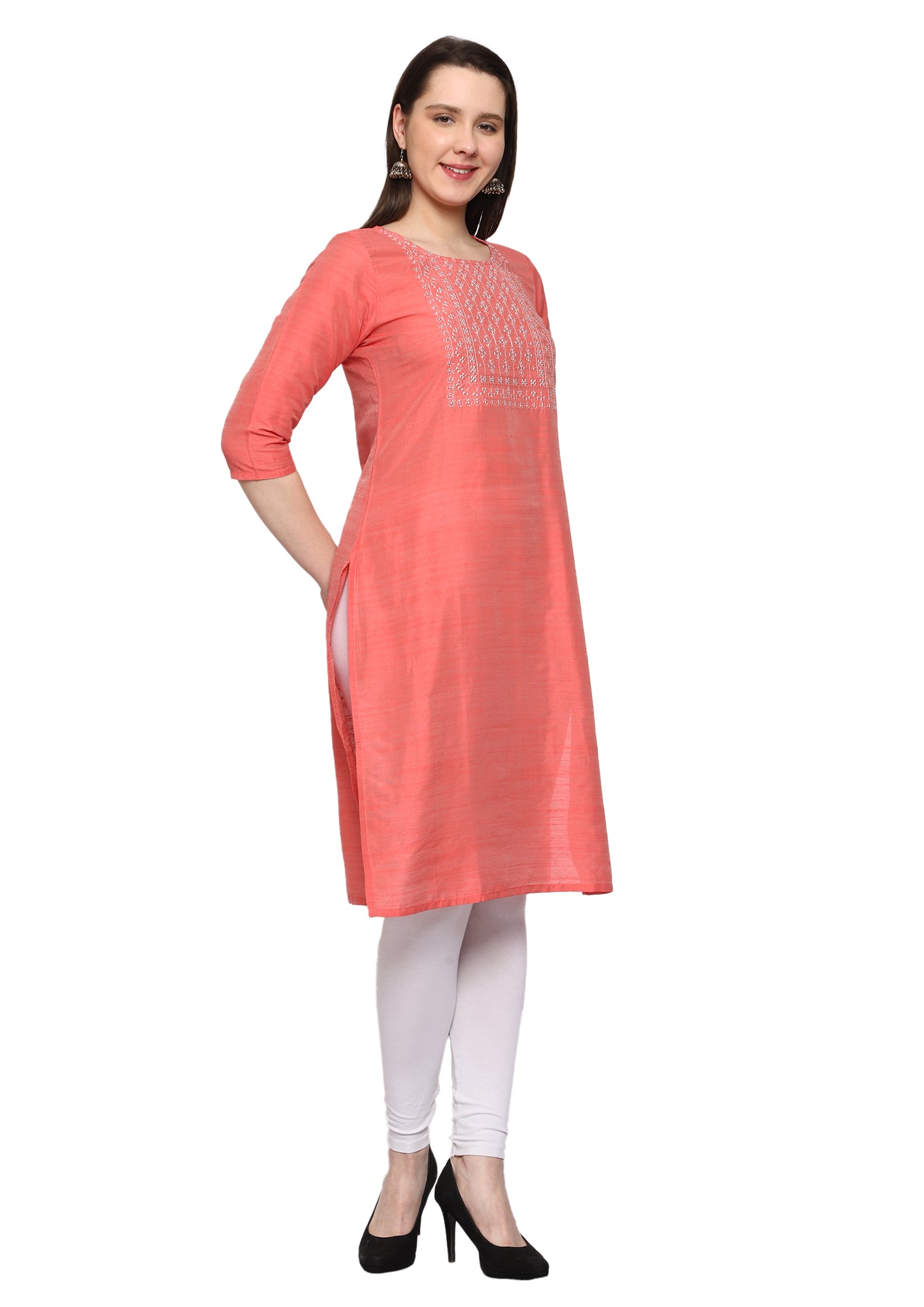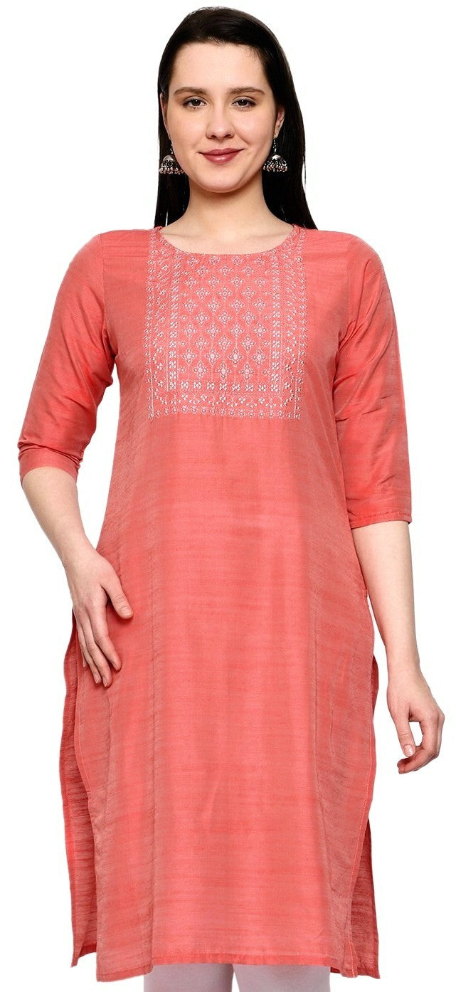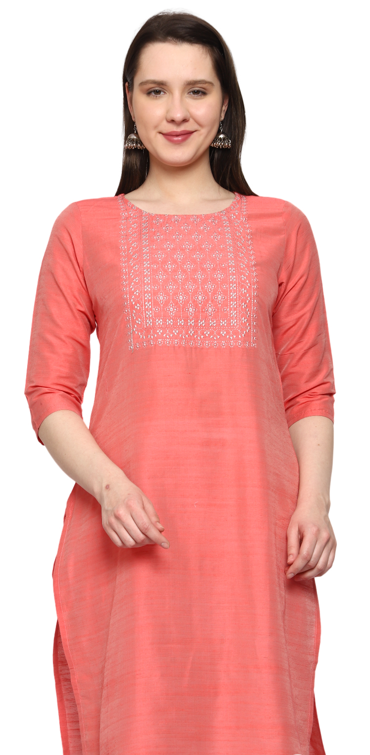 This peach-colored Women's Embroidery Slub Silk Kurti is made from soft material and features intricate embroidery. Made for comfort and style, it is perfect for any casual occasion. Add a touch of elegance to your wardrobe with this pastel colored kurti.
